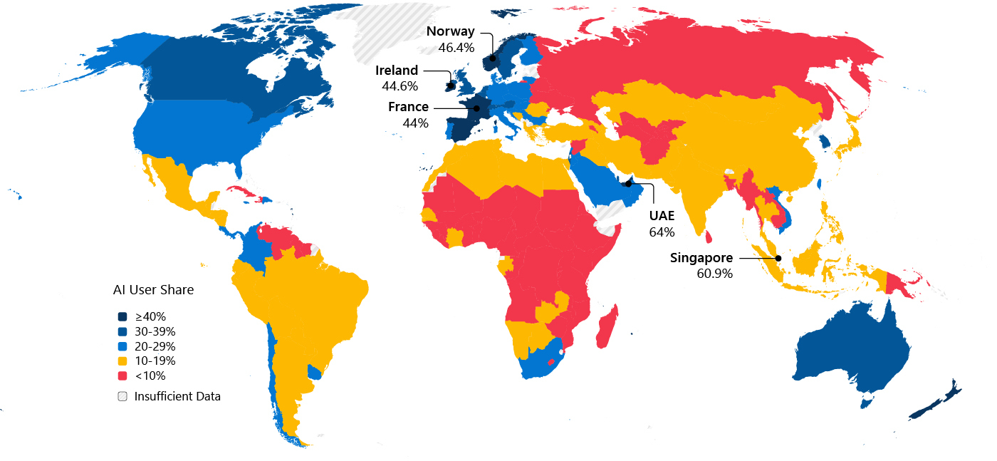 Microsoft опубликовала доклад, посвящённый вопросу распространения технологий искусственного интеллекта по всему миру. За минувшие полгода мировое население стало активнее пользоваться новыми технологиями. Некоторые страны добились особого успеха благодаря стройной государственной политике. Одним из наиболее примечательных явлений стал китайский сервис DeepSeek.
