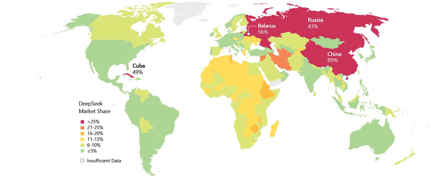 Источник изображения: Nguyen Dang Hoang Nhu / unsplash.com По словам Смита, за прошедший год ситуация в сфере ИИ резко поменялась. Китайские разработчики успели предложить пользователям по всему миру сразу несколько ИИ-моделей с открытым исходным кодом, на обучение которых можно тратить гораздо меньше ресурсов, чем в случае с западными решениями. При этом уровень быстродействия китайских разработок делает их вполне конкурентоспособными. Президент Microsoft убеждён, что именно активные субсидии со стороны властей КНР позволяют китайским разработчикам опережать американских с точки зрения ценовой привлекательности. Доступность и низкая стоимость китайских языковых моделей за прошедшее с момента выхода DeepSeek R1 позволили искусственному интеллекту шагнуть далеко вперёд в масштабах всего мира, а особенно это ощущалось в странах так называемого «глобального юга». Нередко китайские ИИ-модели разработчики в прочих странах могут использовать безвозмездно для адаптации под свои потребности, и это сказывается на их популярности. Западные разработчики стараются монетизировать свои ИИ-решения, предлагая продвинутые функции по платной подписке. По данным исследователей Microsoft, в самом Китае доля DeepSeek на рынке ИИ достигает 89 %, на втором месте оказывается Беларусь с 56 %, третье занимает Куба с 49 %, а России досталось четвёртое место с 43 %. Страны Африки замыкают первую десятку, начиная с восьмого места: Эфиопия (18 %), Зимбабве (17 %) и Эритрея (17 %). Популярность DeepSeek в РФ, Беларуси и на Кубе отчасти объясняется и запретами на использование моделей западного происхождения во многих инфраструктурных проектах.