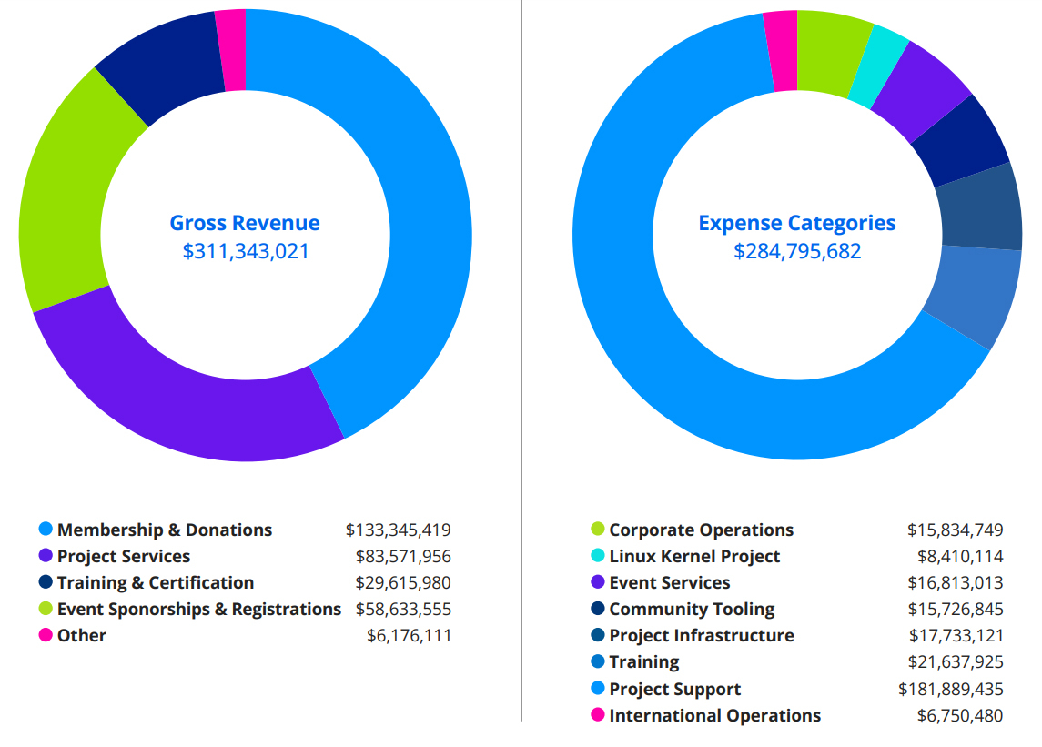 Организация Linux Foundation опубликовала финансовые показатели деятельности в 2025 году. Общие поступления достигли $311,3 млн, что на 6,5 % больше по сравнению с предыдущим годом, когда они составляли $292,2 млн. При этом расходы сократились на 5 % — с $299,7 млн до $284,8 млн. В общем объёме выручки на пожертвования и взносы, а также средства участников организации в 2025-м пришлось $133,3 млн. Ещё $83,6 млн составила целевая поддержка проектов, $58,6 млн — спонсорство мероприятий и регистрационные взносы на конференциях. Поступления от обучающих курсов и выдачи сертификатов оцениваются в $29,6 млн. Все прочие виды деятельности вместе взятые принесли $6,2 млн. Крупнейшей статьёй расходов является поддержка проектов — $181,8 млн. На программы обучения в 2025 году потрачено $21,6 млн, на инфраструктуру — $17,7 млн, на проведение мероприятий — $16,8 млн. Приблизительно $15,8 млн израсходовано на поддержание корпоративных операций, $15,7 млн — на сопровождение сообщества. На проекты, связанные непосредственно с ядром Linux, затрачено $8,4 млн (менее 3 % от всего бюджета). Примерно $6,8 млн пришлось на международные операции. В отчете говорится, что по итогам 2025 года Linux Foundation курировала почти 1500 проектов против примерно 1300 годом ранее. Их наибольшая доля связана с облачными технологиями, контейнерами и виртуализацией — 23 %. На втором месте находятся сетевые и периферийные решения с 14 %, а замыкают тройку проекты в области искусственного интеллекта, машинного обучения и аналитики данных с 12 %. Около 12 % приходится также на кроссплатформенные решения, 10 % — на разработку веб-сервисов и приложений, 5 % — на безопасность. Суммарный вклад всех прочих проектов (блокчейн, интернет вещей, встраиваемые системы, DevOps и др.) оценивается в 24–25 %. Представлен прямоходящий модульный робот Tron 2 — «полземлекопа» по-китайски