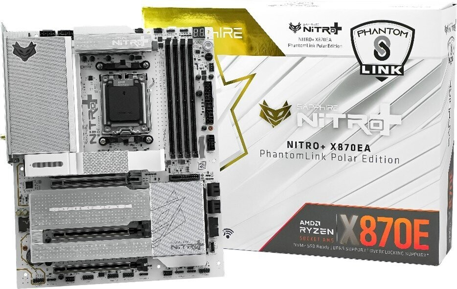 Sapphire выпустила в Китае видеокарту Nitro+ Radeon RX 9070 XT PhantomLink PE, а также материнские платы Nitro+ X870EA PhantomLink и Nitro+ X870EA PhantomLink PE. Новинки выделяются технологией дискретной подачи питания PhantomLink. Она использует слот питания GC-HPWR, аналогичный Asus BTF, расположенный на одной линии с основным слотом PCI Express 5.0 x16 и позволяющий обходиться без кабеля 12V-2×6, хотя разъём для последнего и присутствует в верхней части карты.