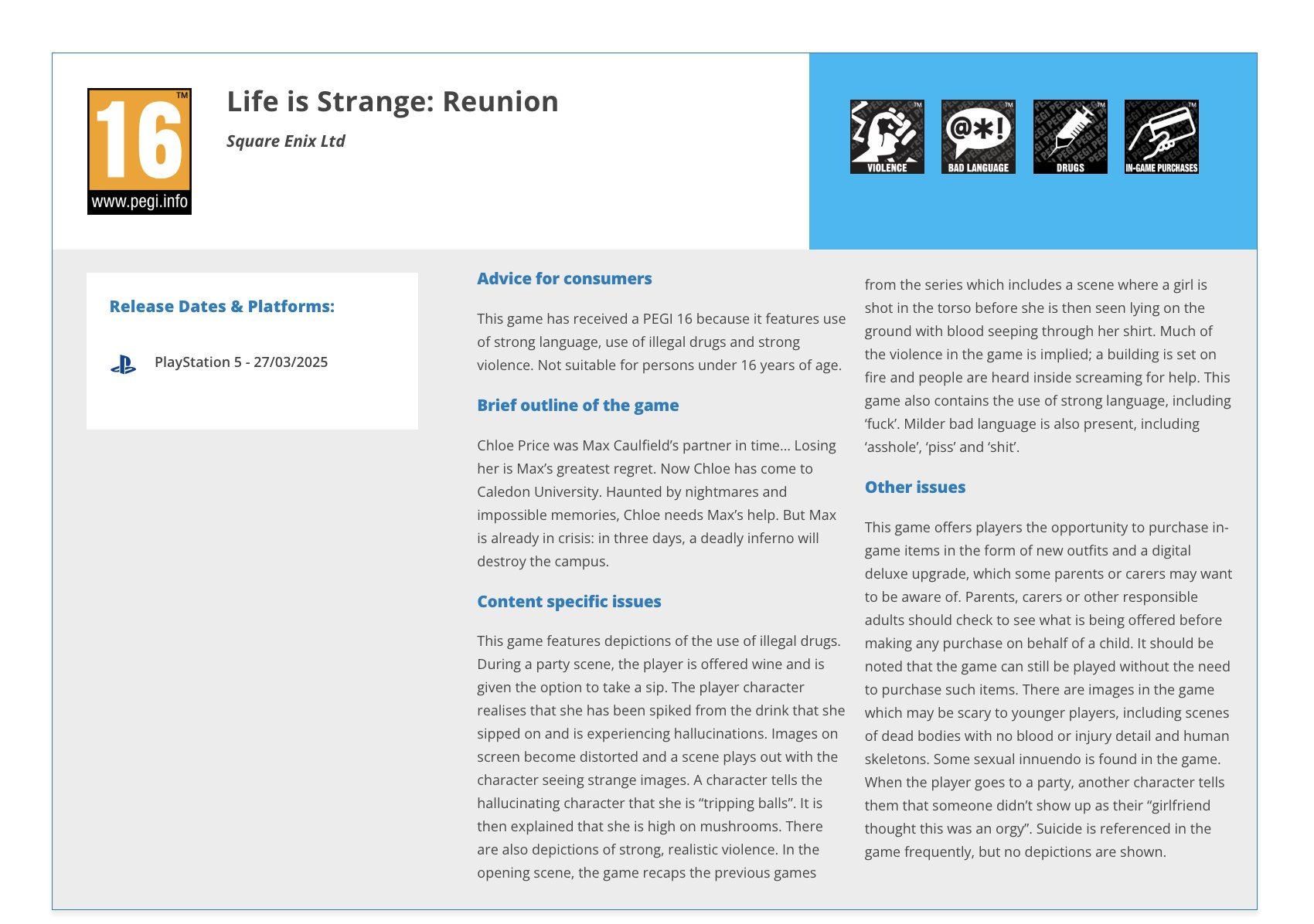 С релиза Life is Strange: Double Exposure прошло лишь немногим больше года, однако издательство Square Enix и разработчики из Deck Nine Games, похоже, уже готовят к выпуску новую игру прославленной приключенческой серии. Европейская возрастная комиссия PEGI (Pan European Game Information) классифицировала Life is Strange: Reunion. Запись об игре с сайта регулятора уже пропала, но утечку удалось зафиксировать (см. изображение ниже). Согласно уже удалённой информации, Life is Strange: Reunion вышла эксклюзивно на PS5 ещё 27 марта 2025 года, однако это не соответствует действительности. На сайте PEGI также приводились подробности завязки игры. По сюжету «преследуемая кошмарами и невозможными воспоминаниями» Хлоя Прайс приезжает в Каледонский университет (место действия Double Exposure) за помощью своей некогда лучшей подруги — Максин Колфилд. Тем временем Макс, для которой потеря Хлои стала самым горьким разочарованием в жизни, столкнулась с другой бедой — «смертоносное инферно» через три дня грозится уничтожить кампус. Life is Strange: Reunion заслужила от PEGI классификацию «от 16 лет» — в проекте фигурирует реалистичное изображение насилия, использование наркотических веществ, сквернословие и внутриигровые покупки. Life is Strange: Double Exposure вышла осенью 2024 года на PC (Steam, Microsoft Store), PS5, Xbox Series X, S и Nintendo Switch. Несмотря на слабые продажи, сиквел игре, по слухам, был гарантирован. Rockstar до сих пор не приступила к полировке GTA VI и не может допустить осечки — от игры «зависит судьба всего акционерного капитала Take-Two»